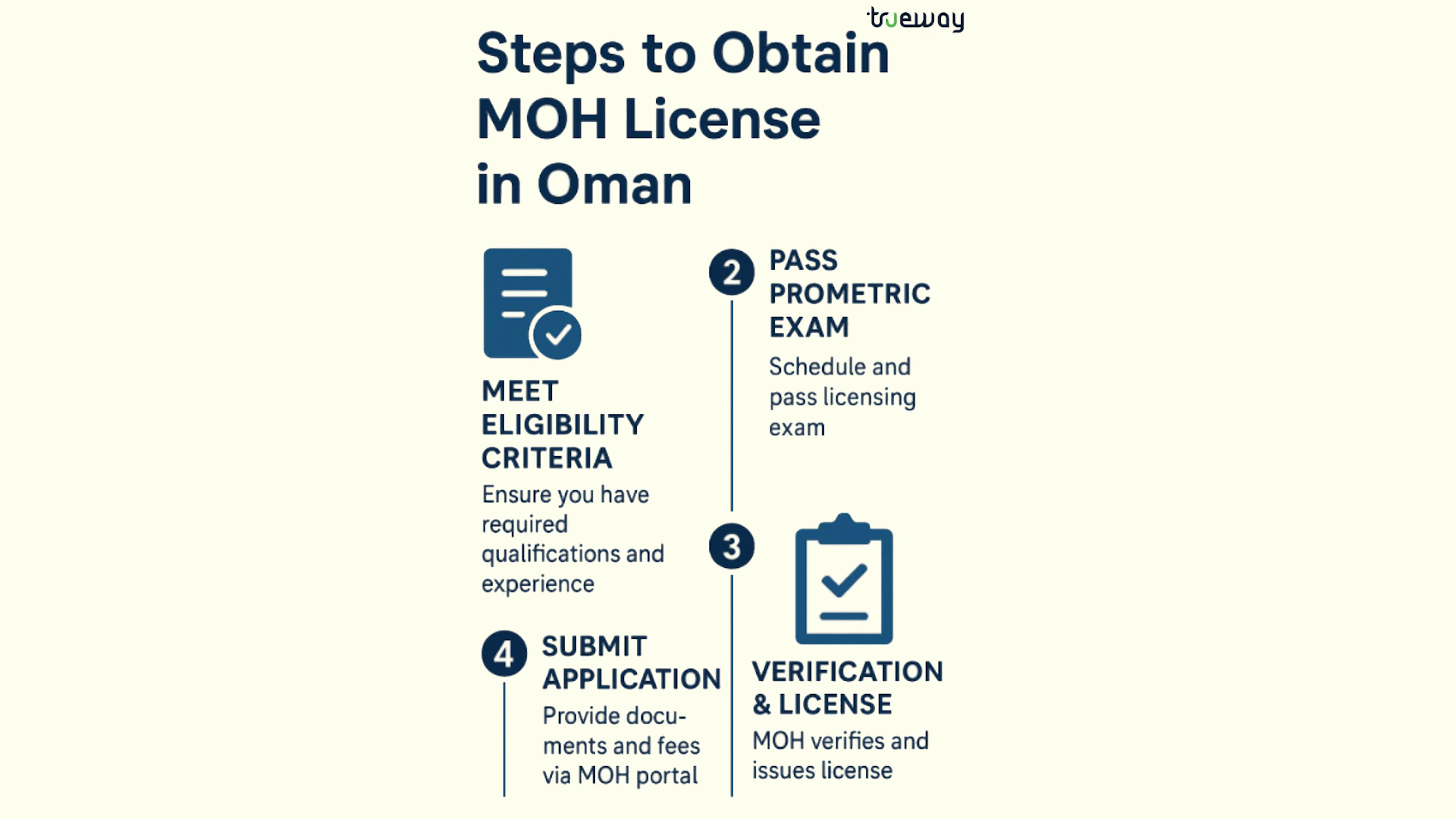 Trueway International provides expert-led MOH Oman Prometric coaching with practice tests, updated syllabus guidance, and one-on-one support tailored for nurses, doctors, and pharmacists.